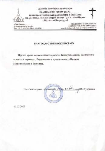 Профессиональная установка акустики в церкви или храме, а также в других культовых помещениях включает знание требований и особенностей проводимых в них мероприятий. Поэтому в работе над такими проектами мы руководствуемся словами народной мудрости: Со своим уставом в чужой монастырь не ходят, и в озвучивании храмов и церквей учитываем как акустическую составляющую, так и этические особенности звукоусиления.