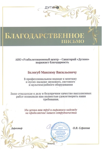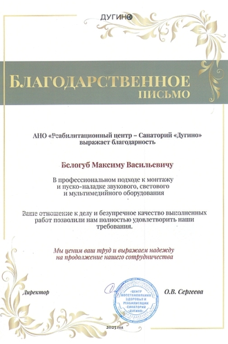 Полное удовлетворение заказчика: санаторий "Дугино" отметил слаженность работы нашей команды, а гости санатория — современный технологичный элемент, значительно усиливший атмосферу праздничных мероприятий и деловых событий.